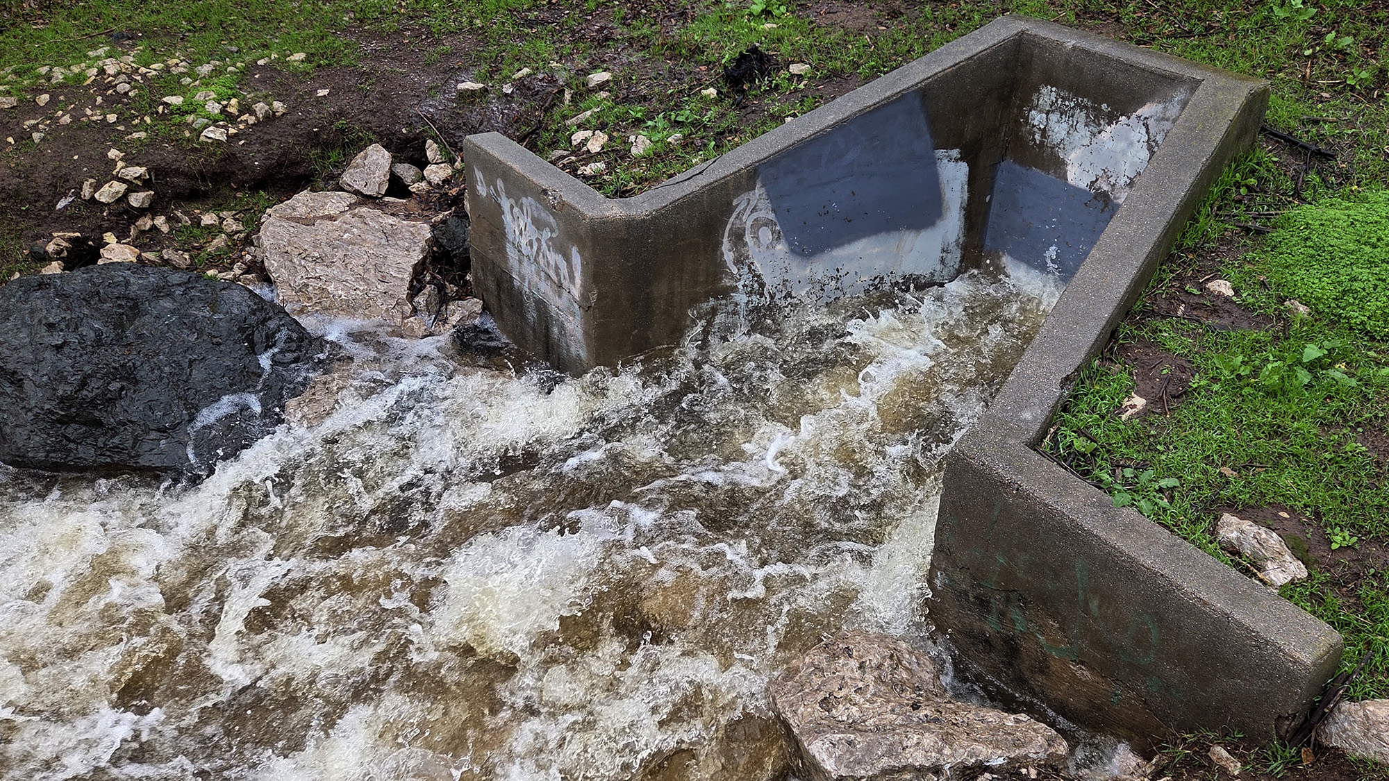 Jan 3, 2026: Spilling (~4 inches above spill level during peak of storm)
